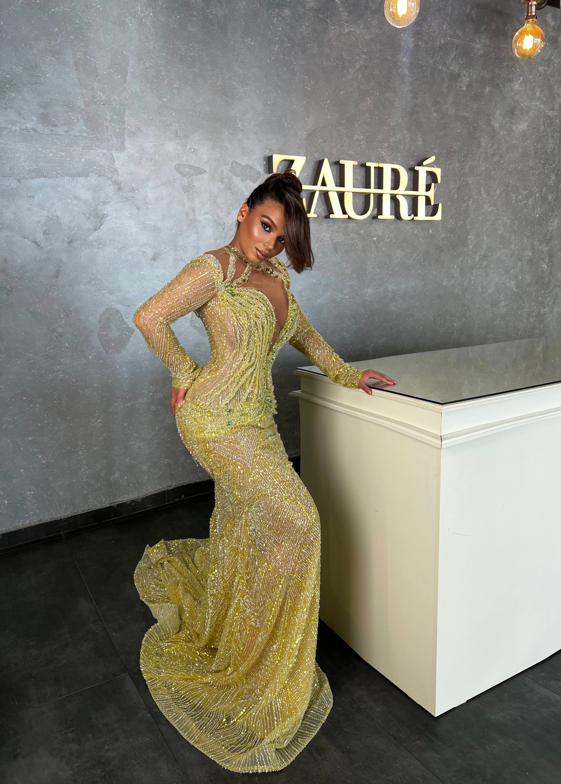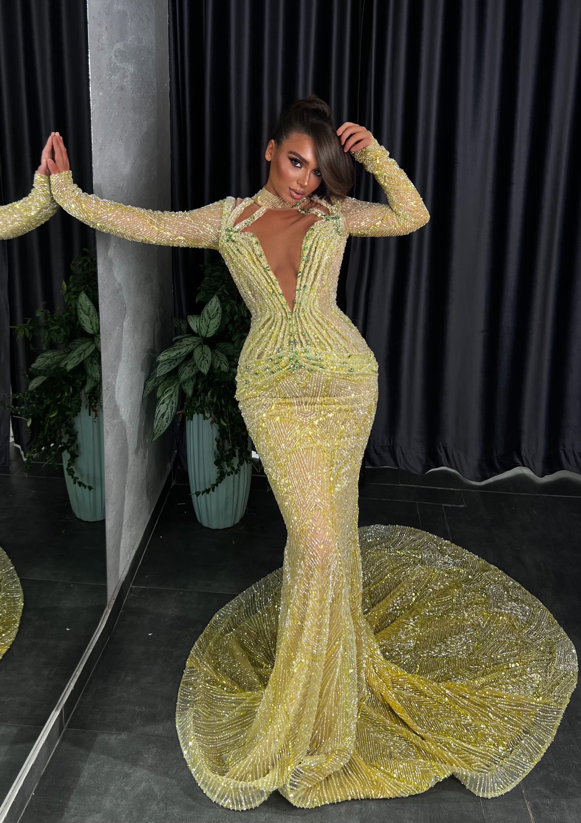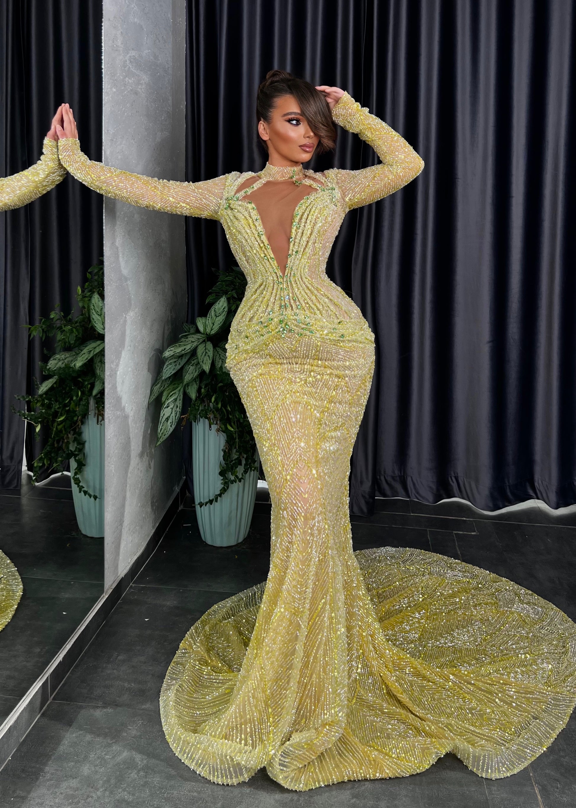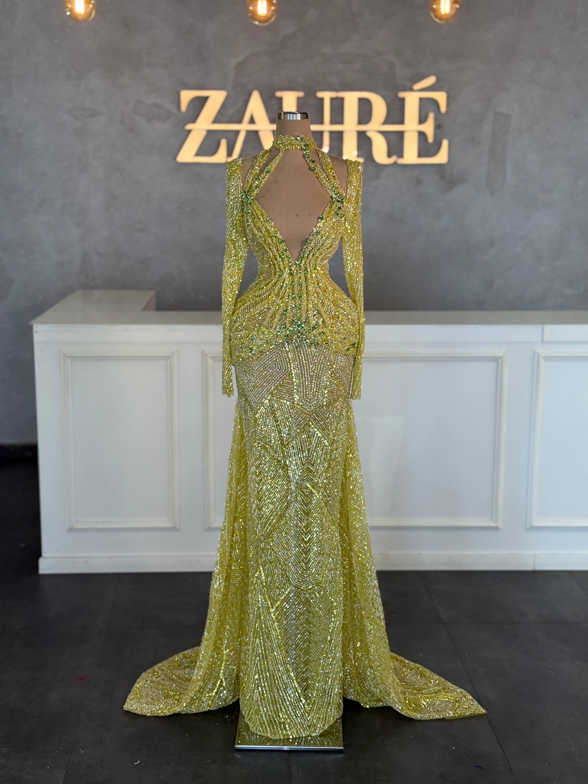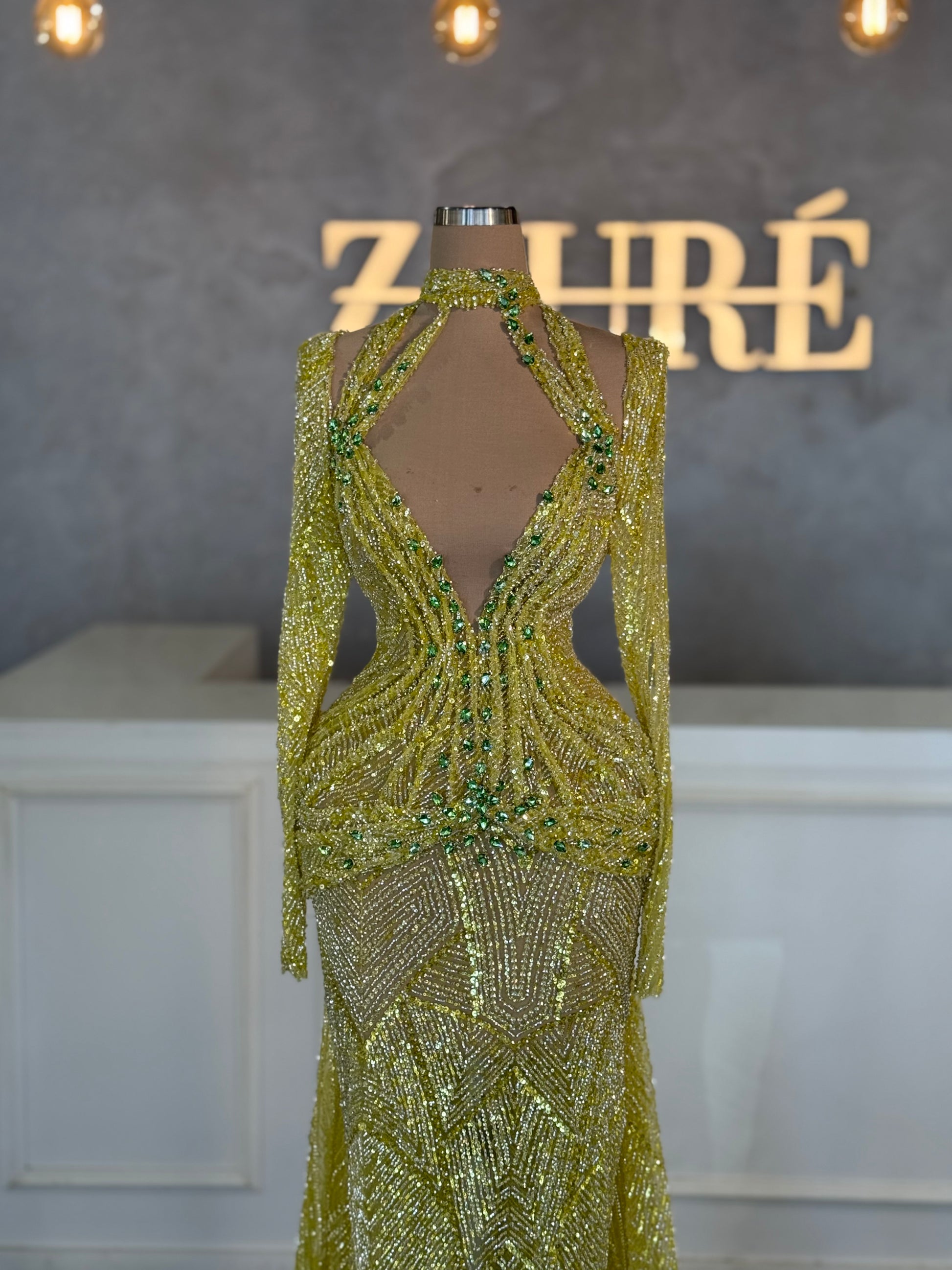 Stunning green mermaid gown is a true couture masterpiece, designed to captivate from every angle. Meticulously hand-beaded from bodice to hem, the dress shimmers with every step, catching the light in a cascade of emerald brilliance. The form-fitting silhouette hugs the body before flaring dramatically at the knees, evoking the elegance of ocean waves. Perfect for red carpets, galas, or any moment made for unforgettable glamour.