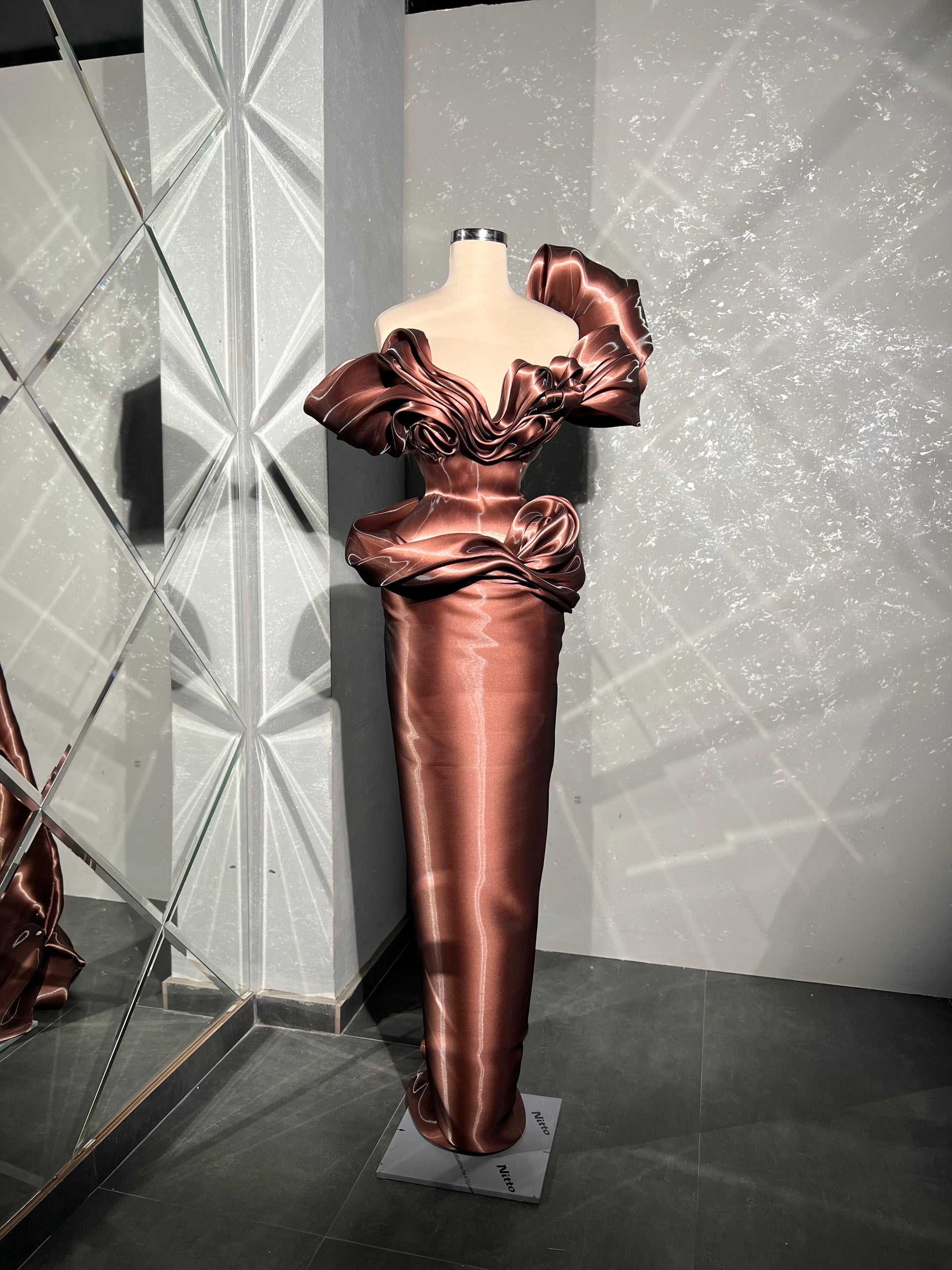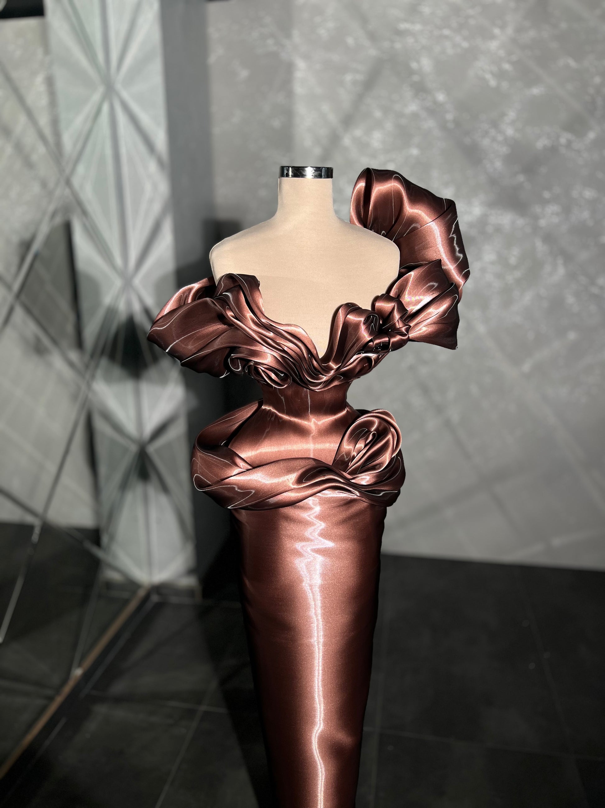 An ode to sculptural elegance, this rich brown draped dress is crafted entirely from weightless organza silk, flowing like smoke across the skin.