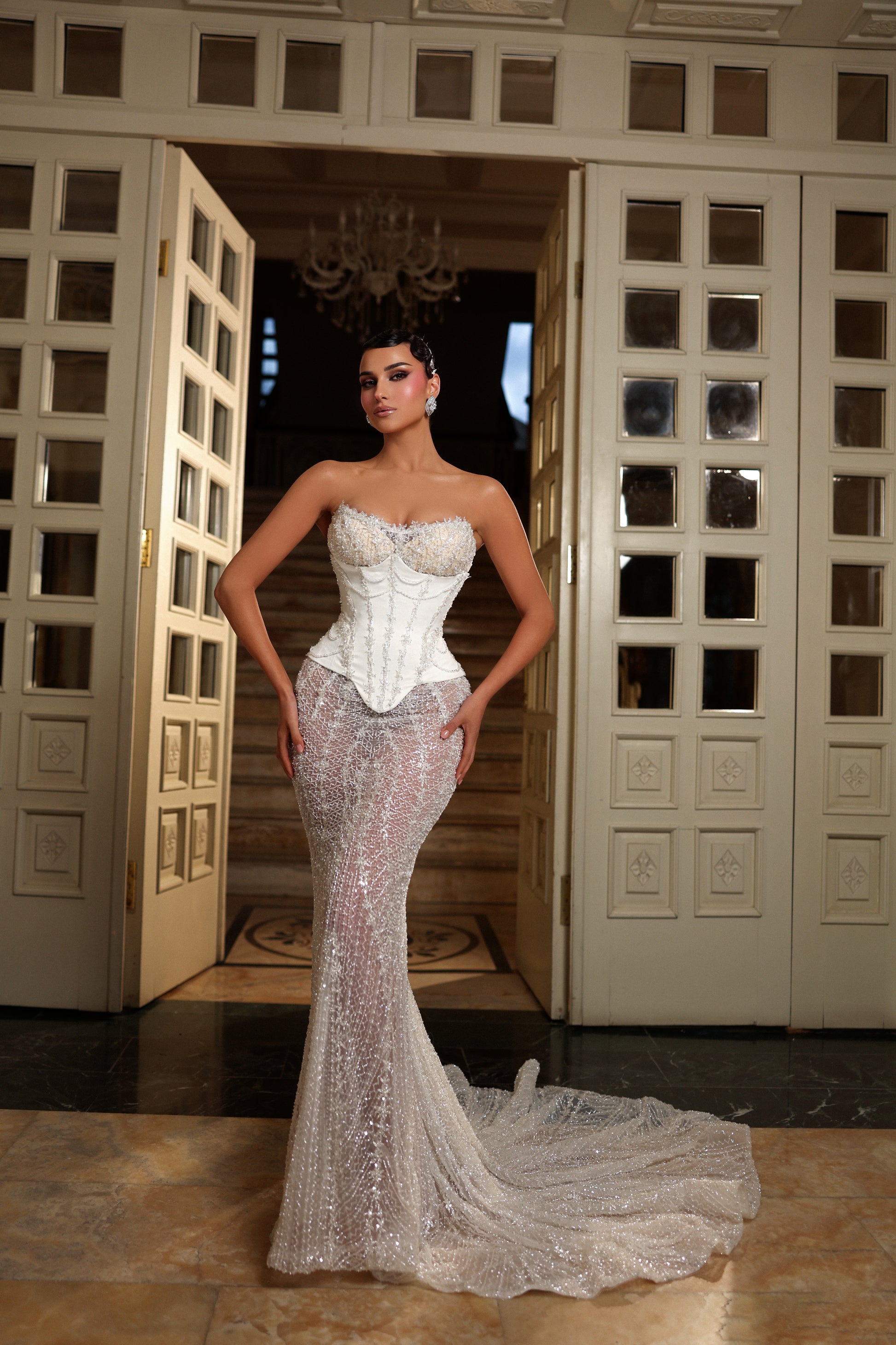 All handmade beads and corset with 2 options satin with beads crystals and pearls